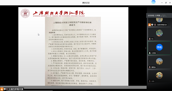 习近平总书记指出:“世间事,做于细,成于严。从严是我们做好一切工作的重要保障。”按照上级文件精神,本次主题党日活动紧密围绕《上海财经大学浙江学院党员严守规矩和纪律承诺书》,各位党员学习严守规矩和纪律承诺书,对标承诺书并自查发言。党员们提问题,谈感想。会议要求全体党员增强“四个意识”,做到严明政治纪律,严守政治规矩。与会党员认为,政治纪律、政治规矩是党员同志的基本准绳,任何时刻都要对党忠诚,严守纪律。全体党员签订严守规矩和纪律承诺书,坚持把纪律规矩挺在前面,切实在守纪律、讲规矩上作表率。