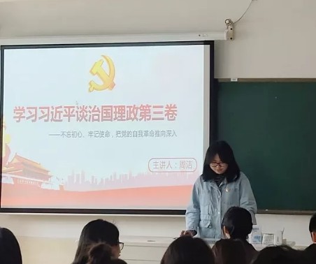 学习会伊始,周洁同志首先强调了不忘初心、牢记使命的主题,从筚路蓝缕到脱贫攻坚,党的初心使命始终坚守不移。其次周洁同志指明了自我革命精神的重要性,党坚持以伟大的自我革命来引领实现中华民族伟大复兴的梦想。最后周洁同志号召学生党员们通过学习习近平新时代中国特色社会主义思想来着力解决党自身存在的突出问题。本次学习会的召开意在通过对《习近平谈治国理政第三卷》的学习,来用习近平新时代中国特色社会主义思想武装全党,建设高素质学生党员队伍,加强基层组织建设,持之以恒正风肃纪。