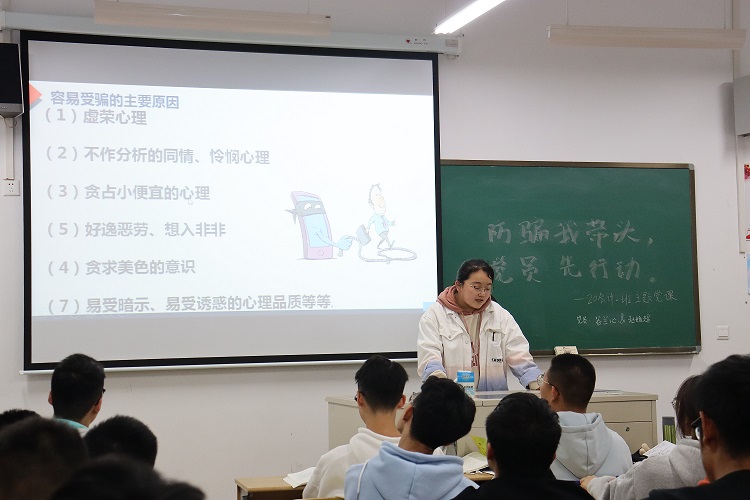 在20会计学二班,学生党员谷兰心同志从“什么是诈骗”、“诈骗的常见形式”、“如何识别防范诈骗”和“上当后的补救措施”四个角度为同学们开展了这一次的主题党课。