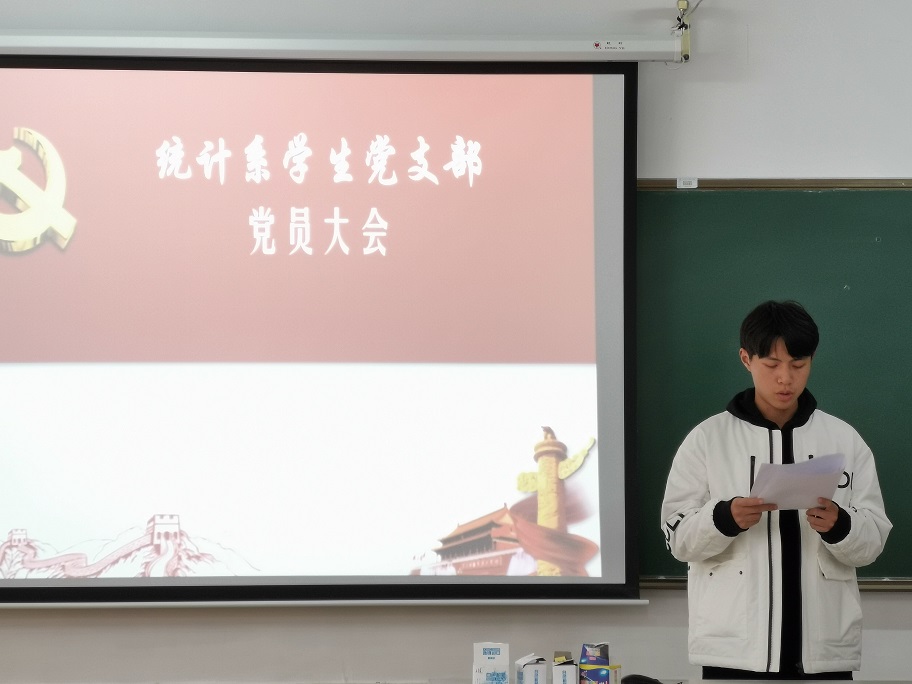 会议由统计系学生党支部组织委员吴文洁主持。大会主要议题是讨论、接收吴越、张玉芹等十六名发展对象为中共预备党员。会上,十六名发展对象依次汇报了自己的入党志愿,表明入党态度,阐述对党的认识,表达了入党决心等;入党介绍人分别介绍了以上同志的基本情况并发表了本人意见;支委会成员对他们的政审情况等信息进行汇报;与会党员就他们的学习、工作及思想觉悟等方面进行了补充。最后,经大会具有表决权的正式党员无记名票决,一致同意接收吴越等十六名同志为中共预备党员。