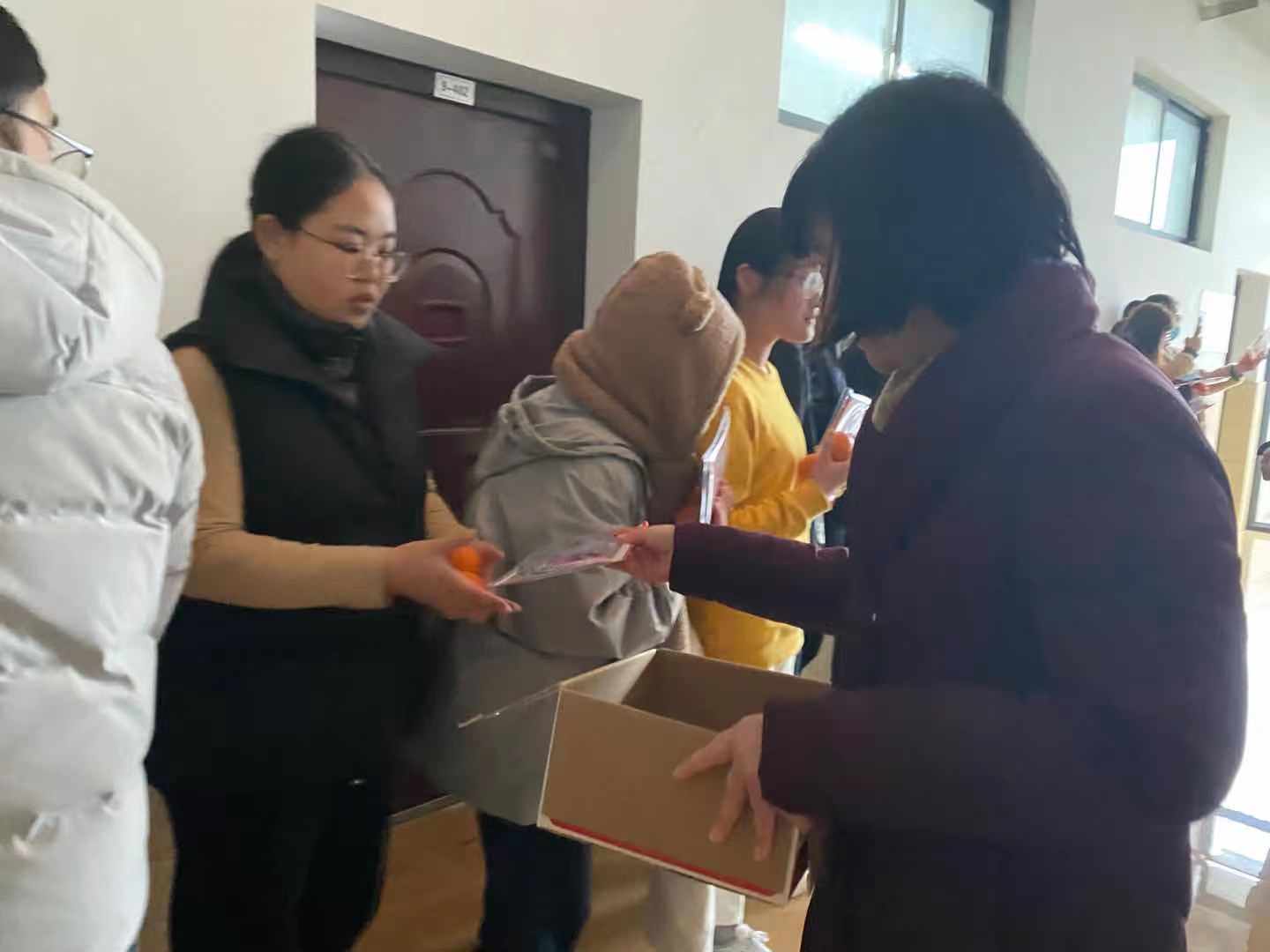 活动最后,教工党员将文具福袋和寓意吉祥如意的桔子亲手交给每一位考研学生并祝愿同学们取得优异成绩。