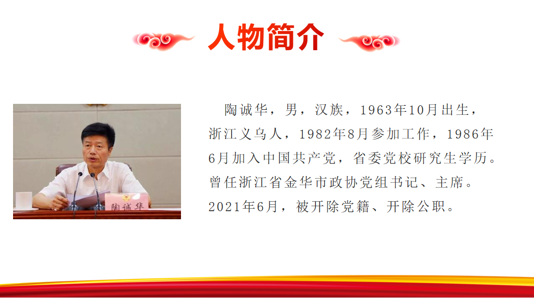 会议第三项,由黄淞同志带领我们学习陶诚华典型案例。首先黄淞同志和我们介绍了金华市政协原党组书记、主席陶诚华的基本情况。陶诚华因丧失理想信念,对党不忠诚不老实,严重违反党的纪律构成严重职务违法并涉嫌受贿犯罪被开除党籍和公职。陶诚华腐败一例给我们每位党员敲响了警钟,告诫全体党员,以案为鉴,吸取他人的教训,时刻筑牢饭腐倡廉的思想防线,警钟长鸣。