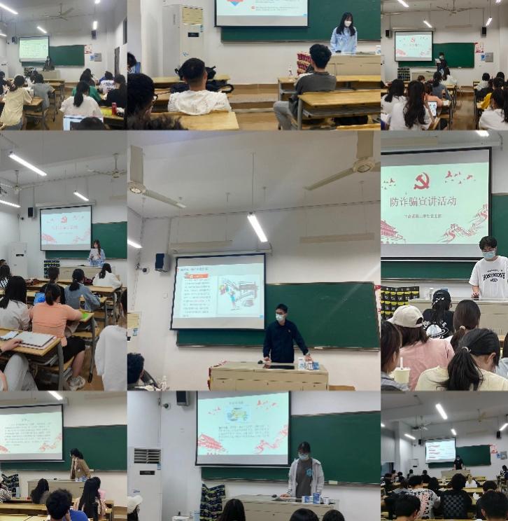 为纵深推进“学党史办实事”实践活动,不断提高我院师生的反诈意识和防骗能力,工商管理系第三学生党支部组建了一支由党员、发展对象、入党积极分子和反诈志愿者组成的防诈骗宣讲团。5月5日,工商管理系第三学生党支部防诈骗宣讲团深入到工商管理系2021级各班进行防范电信网络诈骗的宣讲活动。