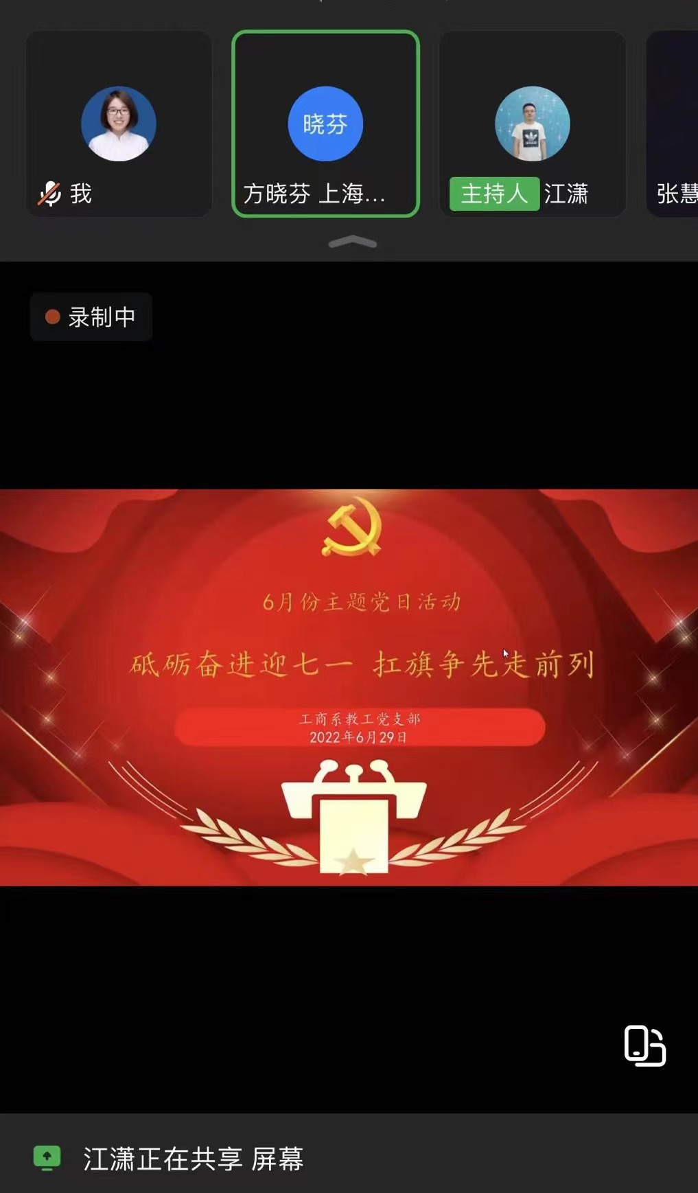 为继承和弘扬党的优良传统,充分激发党员奋勇拼搏的使命责任,在七一建党节来临之际,工商系教工支部于6月29日晚,在钉钉群召开了“砥砺奋进迎七一 扛旗争先走前列”线上主题党日活动。会议由教工支部组织委员江潇主持,全体教工党员参加。