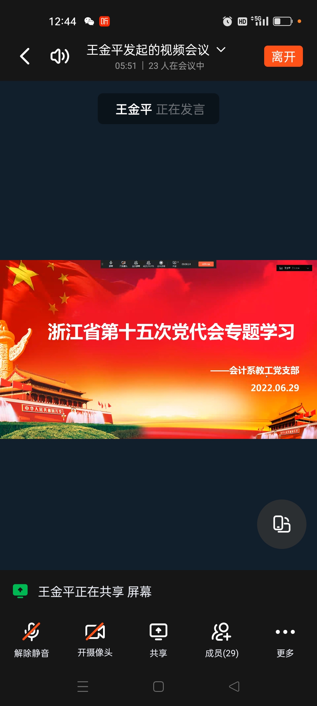 6月29日中午,会计系教工党支部在线上开展“浙江省第十五次党代会专题学习”微党课。微党课由教工党支部书记王金平同志主讲。