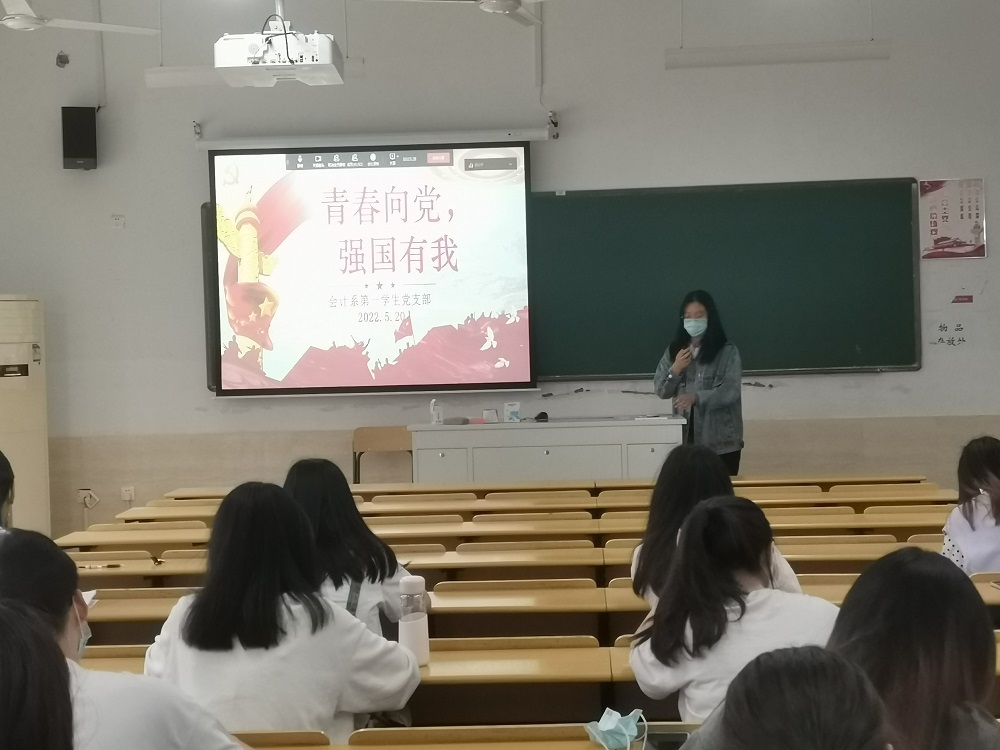 为深入学习青年模范榜样,加强党史教育学习,培养青年党员的优良品质。2022年5月20日12时30分,会计系第一学生党支部于7-106开展“青春向党,强国有我”主题微党课,由周靓同志、丁兴同志、司想同志和刘慧洁同志担任主讲。