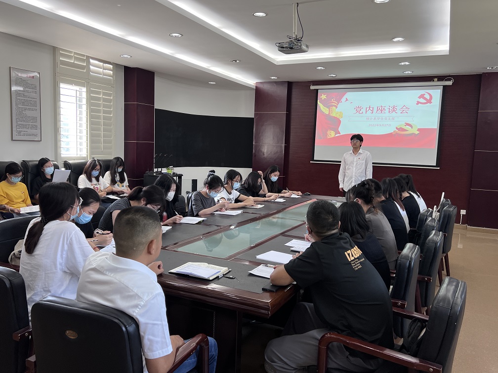 2022年9月27日,统计系学生党支部在29幢226会议室召开了2022年下半年发展对象党内座谈会。出席此次会议的有统计系学生党支部书记李歆、统计系学生党支部全体学生党员,座谈会由李歆主持。
