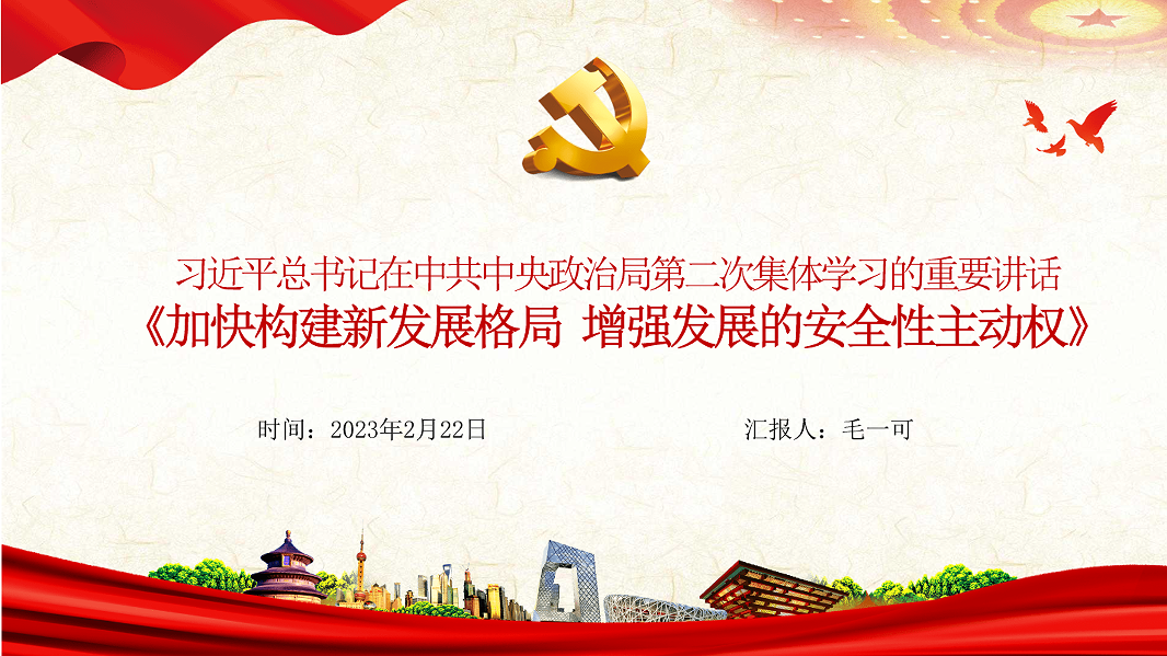 会议第二项,由毛一可同志领学习近平总书记在中共中央政治局第二次集体学习的重要讲话《加快构建新发展格局,增强发展的安全性主动权》。毛一可同志重点讲述了新发展格局的重大意义,要加快构建以国内大循环为主体、国内国际双循环相互促进的新发展格局。