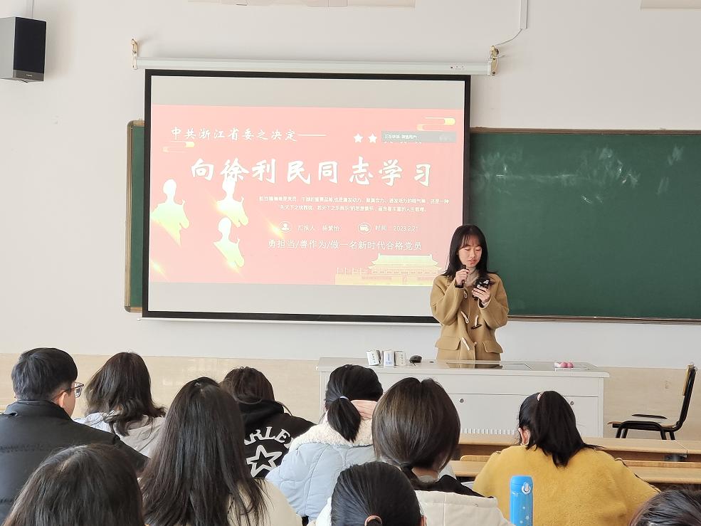 杨紫怡同志以《中共浙江省委关于开展向徐利民同志学习活动的决定》和“金华市‘两会’精神”为主题进行了学习分享,她共分为五个部分阐述:第一部分是牢记使命 服务大局;第二部分是坚守宗旨 为民尽责;第三部分是攻坚克难 实干笃行;第四部分是公而忘私 甘于奉献;第五部分是金华市“两会”精神。