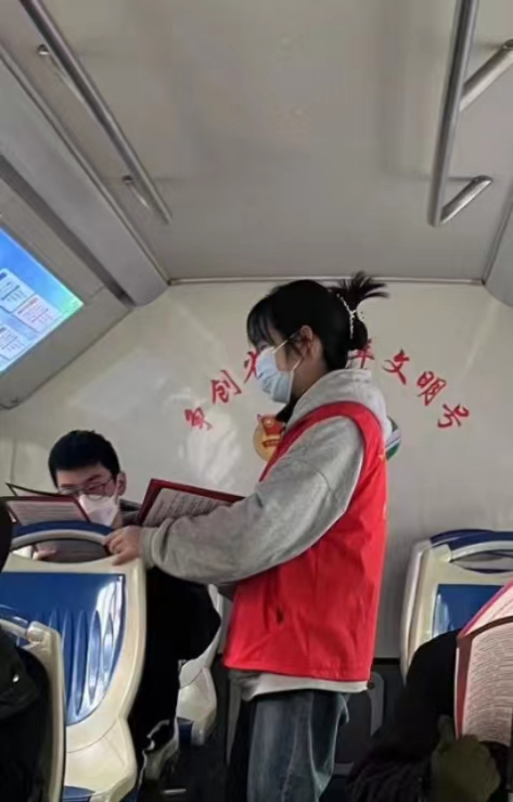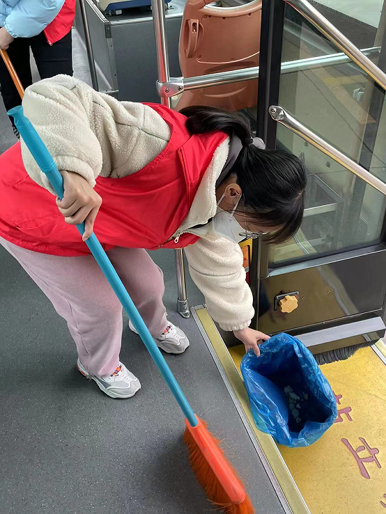 为提升青年党员与入党积极分子的社会实践水平,2月24日、25日本学期K20公交志愿活动正式启程,会计系学生党员与入党积极分子穿上红马甲乘坐K20公交一同出发。为了能让乘客们有一个舒适的乘车环境,志愿者们一起拾起清洁工具打扫车厢内角角落落的卫生。在路途中,志愿者们维持公交车内的秩序,并帮助腿脚不便老人上下车。志愿者主要的任务是向乘客分发宣传材料,并向乘客宣传和讲解党的二十大精神。