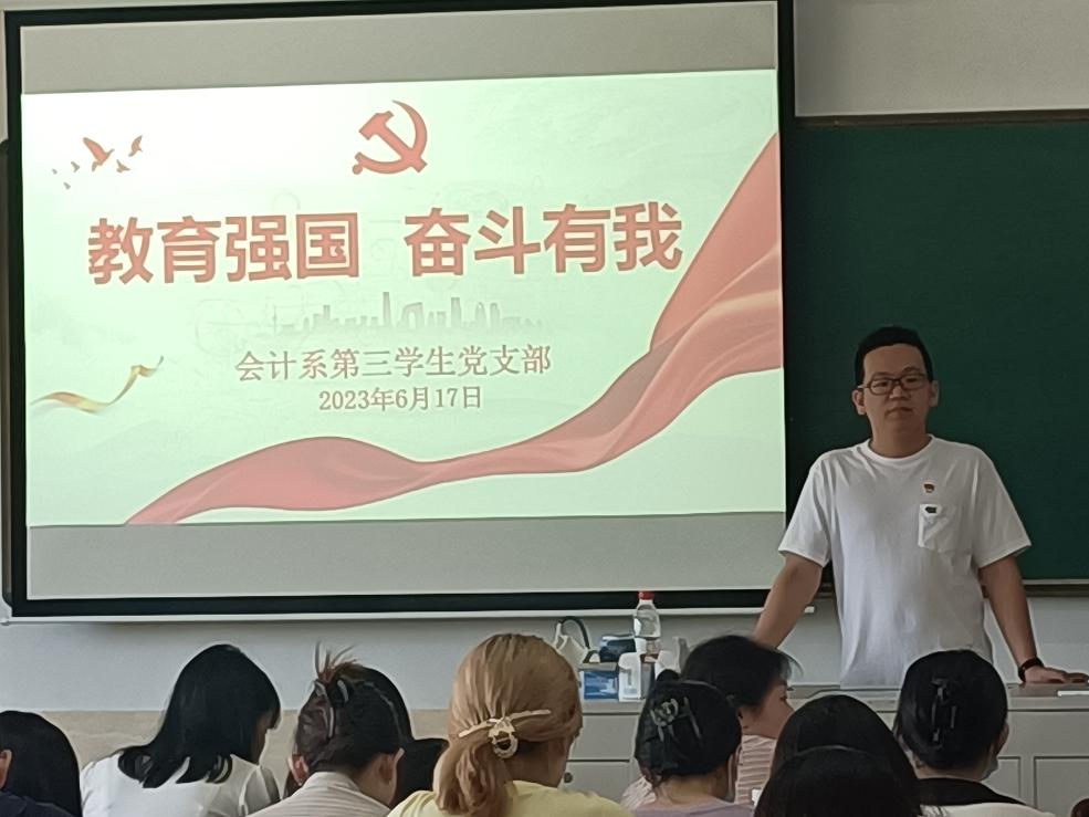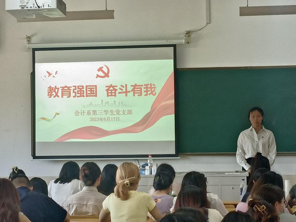 2023年6月17日,会计系第三学生党支部于7幢211教室开展“教育强国,奋斗有我”主题党日,本次主题党日由姚一莎同志主持,黄松书记和姚一莎同志担任主讲,以下是这两位同志的分享。