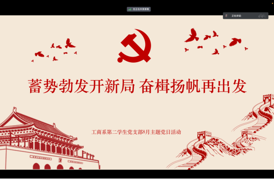 8月20日晚上18:00,工商管理系第二学生党支部以“蓄势勃发开新局,奋楫扬帆再出发 ”为主题在腾讯会议开展8月主题党日活动。党日活动由工商管理系第二学生党支部书记盛奥同志主持。本次党日活动应到党员99名,其中正式党员54名,预备党员45名;实到99名,其中正式党员54名,预备党员45名。
