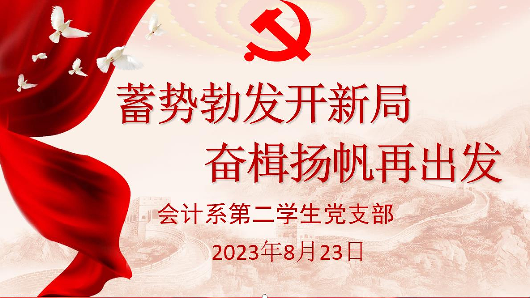 为积蓄发展力量,提高发展信心,2023年8月23日会计系第二学生党支部在线上开展“蓄势勃发开新局 奋楫扬帆再出发”主题党日。以下是吴莹莹同志、丁越同志、赵雪同志的分享。