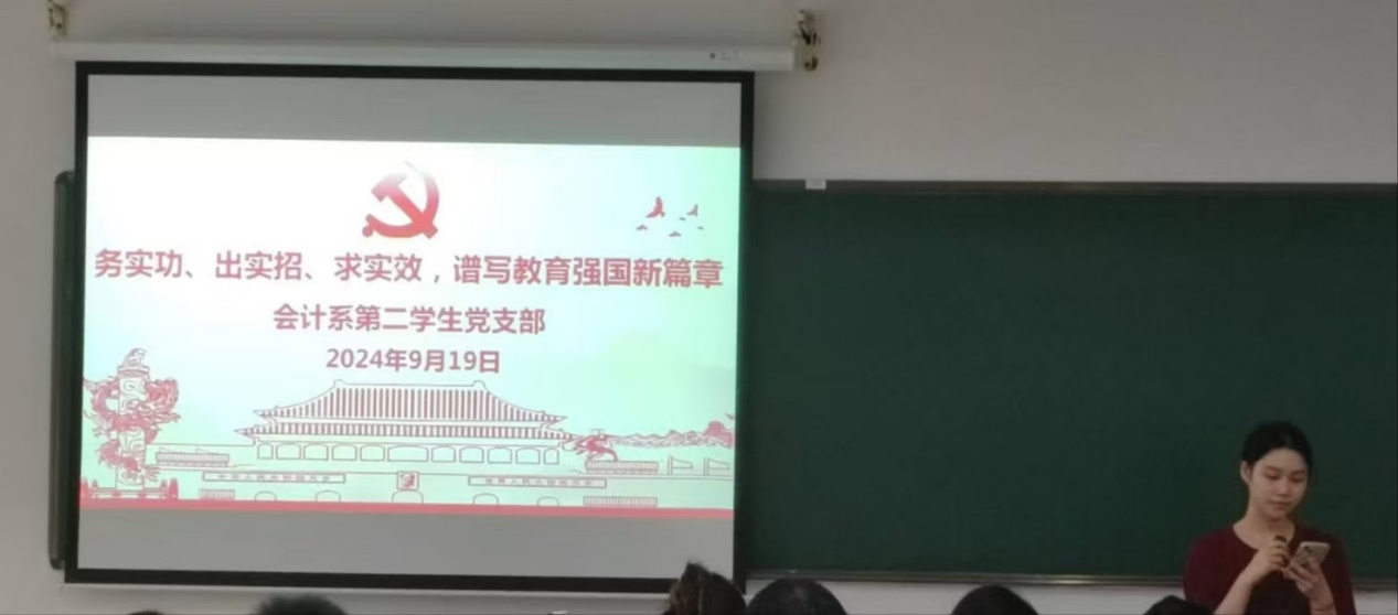 为了坚定教育强国的信念和决心,以更加务实的态度、更加创新的举措、更加注重实效的精神推动教育事业的发展,会计系第二学生党支部于2024年9月19日中午12:30在教室7-106开展“务实功、出实招、求实效,谱写教育强国新篇章”主题党日。本次主题党日以“深入学习习近平总书记在全国教育大会上发表的重要讲话精神,省委十五届五次全会和市委八届六次全会的精神,做好全面深化教育系统改革相关工作研究”为第一议题,并由会计系第二学生党支部书记李辉领学,方嘉颖同志主持,张宇波、唐翌希、徐俪桐同志担任主讲,以下是三位同志的分享。