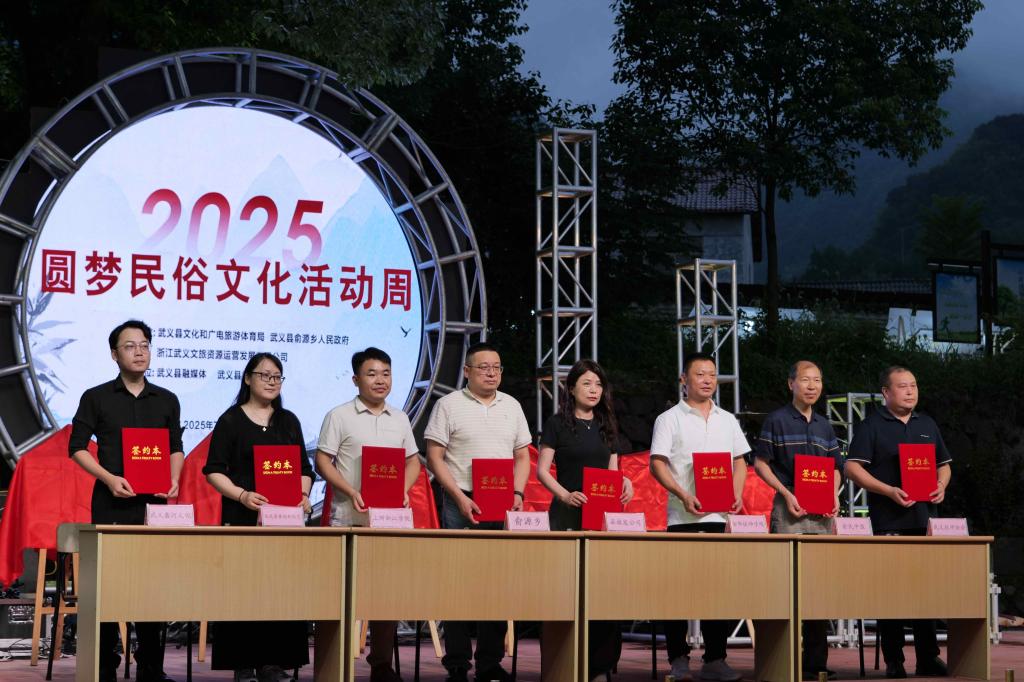 为深入推进高校党建“四个融合”行动,实现校地优势互补,以高质量党建引领业务高质量发展,促进党建工作与教学科研、人才培养、社会服务等各项工作深度融合。7月19日下午,学院工商管理系应邀参加武义县俞源乡“2025俞源圆梦民俗文化活动周”开幕式并签署校地党建联建合作签约。武义县俞源乡党委书记戴军武、俞源乡乡长杨子江、武义县委宣传部副部长王胜、武义县文广旅体局副局长连国平、工商管理系副主任熊璞等参加签约仪式,仪式由俞源乡副乡长金亚楠主持。
