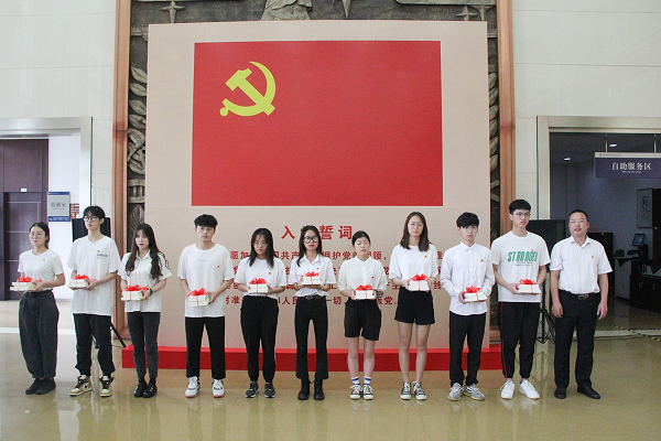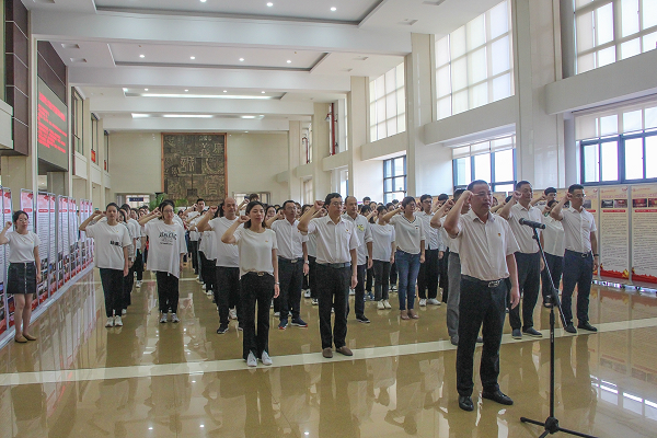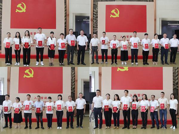 颁奖结束后,现场举行新党员入党宣誓仪式、老党员重温入党誓词。100名新党员代表和50余名老党员身着正装、佩戴党徽、列队肃立。在党委书记王建新领誓下,面对党旗、举起右拳、庄严宣誓。一声声铿锵有力的誓言久久回响,激荡人心。