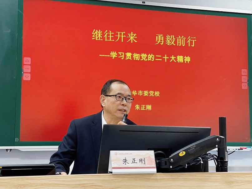 10月26日晚,中共金华市委党校副校长朱正刚作客干部夜学第57讲,作《继往开来 勇毅前行——学习贯彻党的二十大精神》宣讲报告。学院全体中层干部、各系(部)综合办、学工办主任、全体党支部书记、专职组织员等60余人参加报告会。